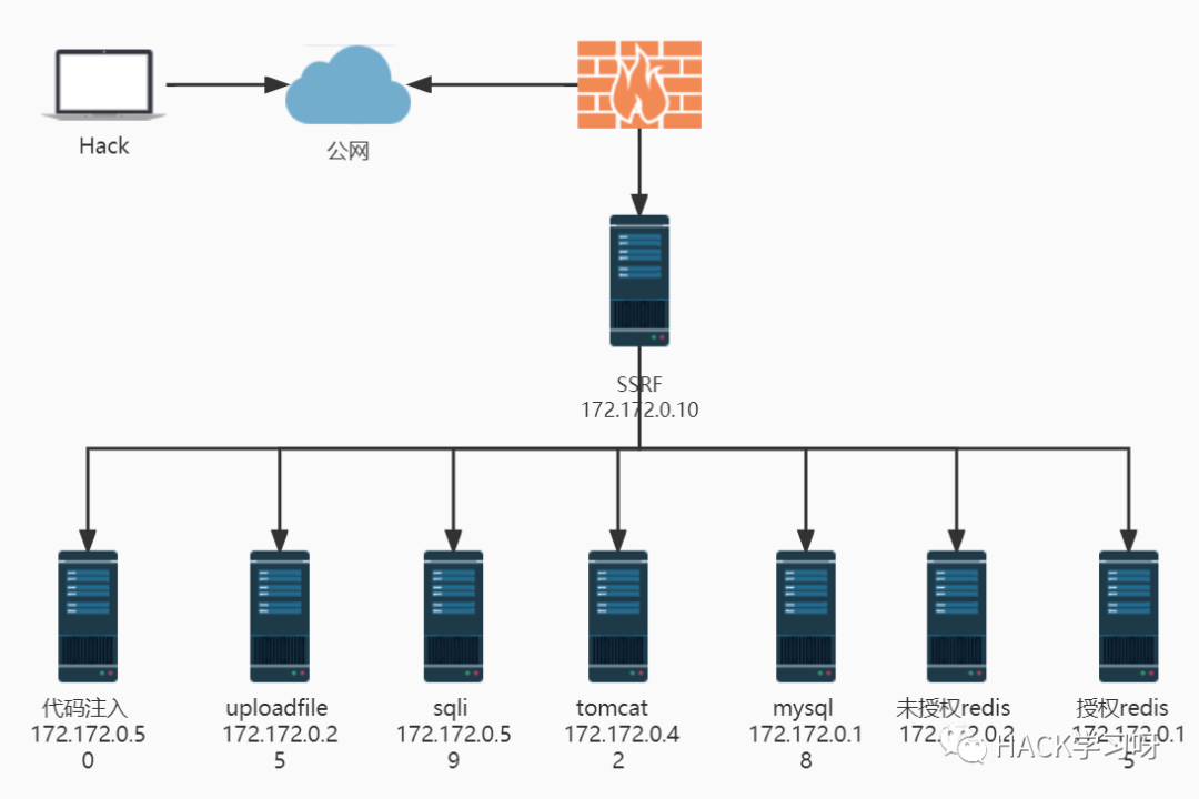 172.172.0.10 这个服务器的 Web 80 端口存在 SSRF 漏洞,并且 80 端口映射到了公网,此时攻击者通过公网可以借助 SSRF 漏洞发起对 172 目标内网的探测和攻击。