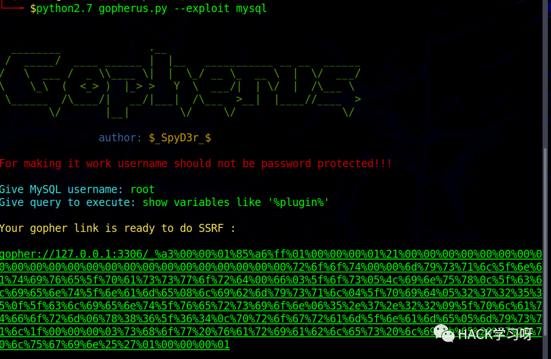 然后用脚本生成上方语句的payload,写入udf文件,,这里的操作我使用脚本没有完成功要使用tcpdump 监听到的原始数据后,转换 gopher 协议,BP 二次编码请求一下