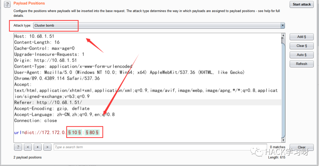 burp爆破模块对ip c段跟端口进行选择然后攻击模式选择Cluster bomb