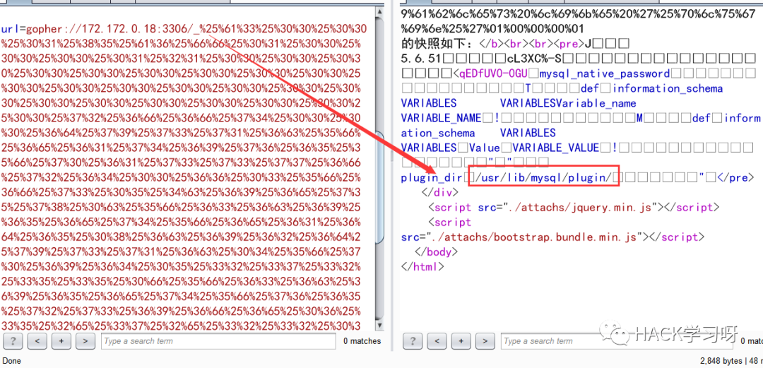 show variables like '%plugin%'放入到 BP 中请求的话记得需要二次 URL 编码,可以直接获取到MySQL 的插件目录为:/usr/lib/mysql/plugin/
