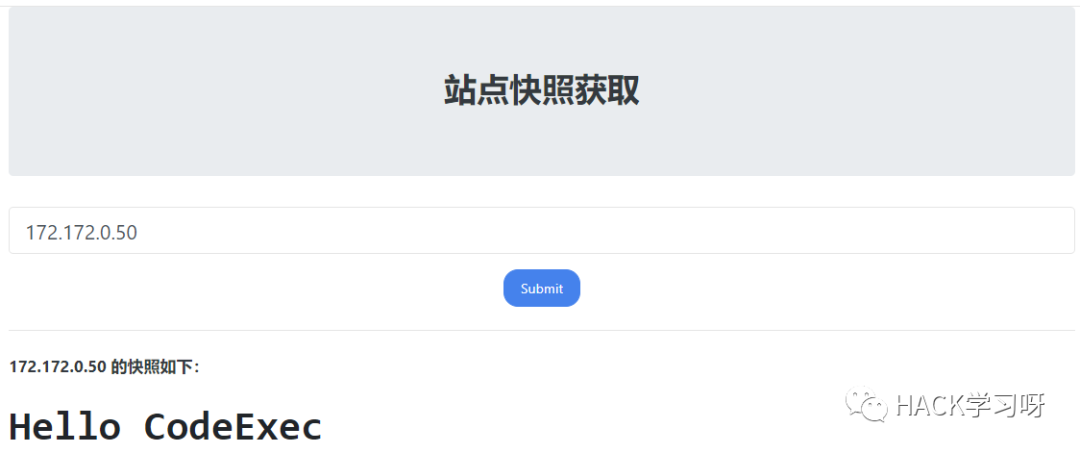 172.172.0.15 6379172.172.0.2 6379 172.172.0.18 3306172.172.0.59 80,3306172.172.0.25 80172.172.0.50 80172.172.0.10 80通过ssrf先请求一下发现了一个首页显示Hello CodeExec