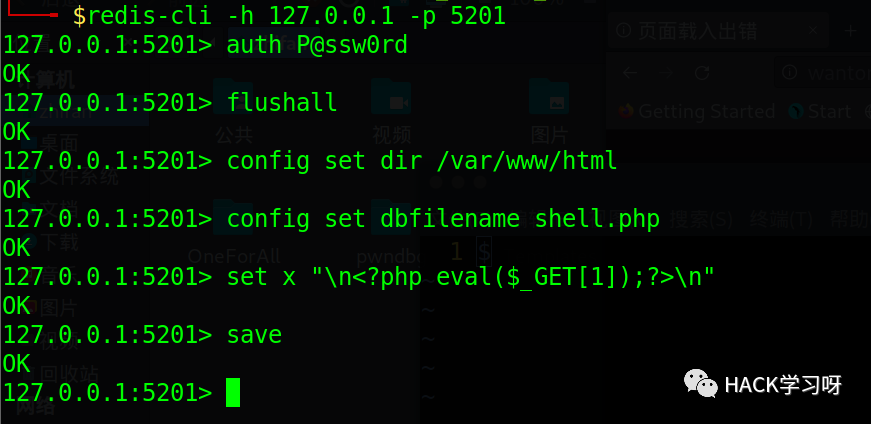 redis-cli -h 127.0.0.1 -p 5201服务器接着会把 5201 端口的流量接受并转发给服务器的 6379 端口,然后认证后进行往网站目录下写入 shell 的操作: