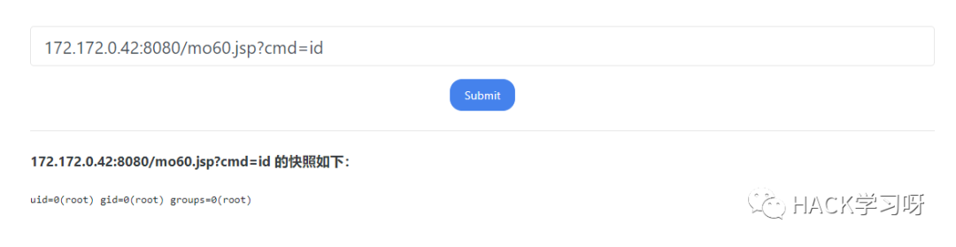 接着通过 SSRF 发起对 mo60.jsp 的 HTTP 请求,成功执行了id 的命令: