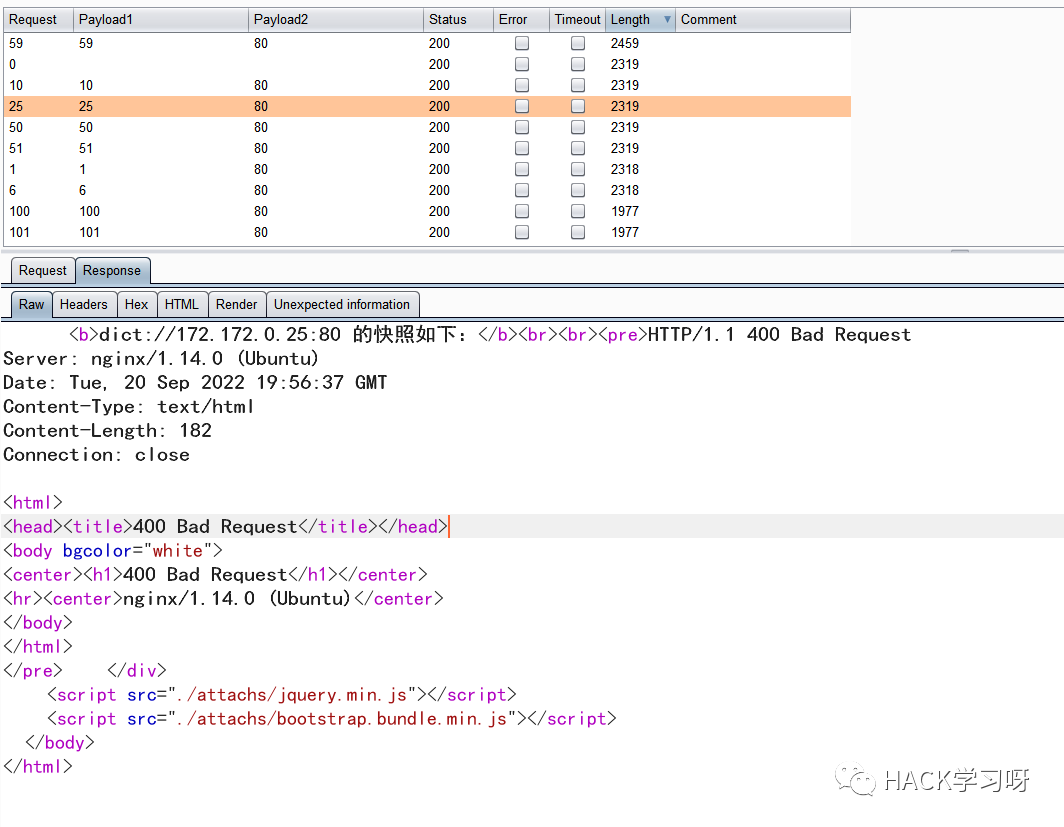 file:///etc/hostsSSRF 常配合 DICT 协议探测内网端口开放情况,但不是所有的端口都可以被探测,一般只能探测出一些带 TCP 回显的端口