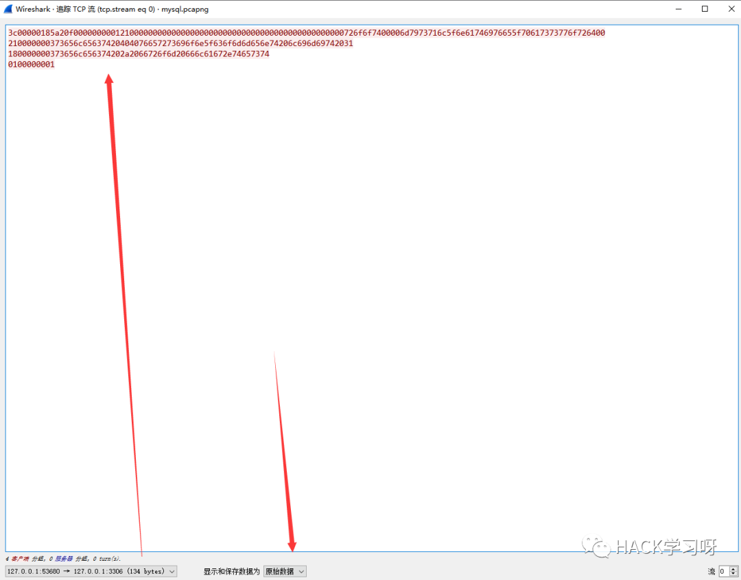+----+----------------------------------------+Wireshark 打开 mysql.pcapng 数据包,追踪 TCP 流 然后过滤出发给 3306 的数据然后过滤出客户端发送到MySQL服务器的数据包,将显示格式调整为原始数据即可: