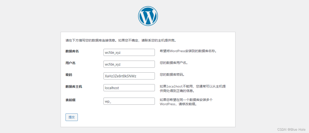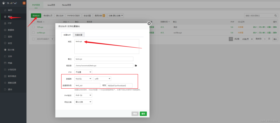 点击宝塔面板的数据库,将刚才创建站点生成的数据库名,用户名,密码填入,并点击提交