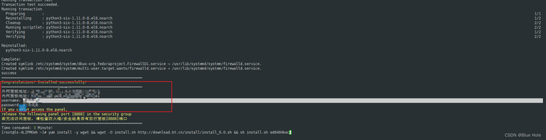 yum install -y wget && wget -O install.sh http://download.bt.cn/install/install_6.0.sh && sh install.sh ed8484bec宝塔面板安装成功