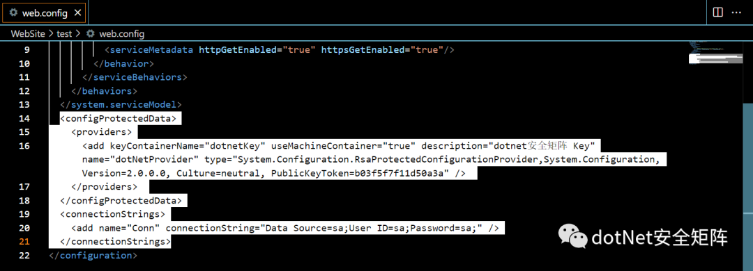 近期有师傅反馈拿到了.NET web.config文件,发现含有数据库账密连接字符串所在的标签<connectionStrings>被加密了,导致看不到MSSQL账户和密码,如下图