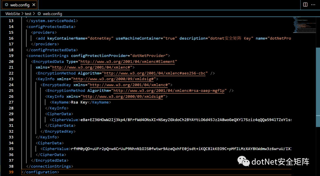 aspnet_regiis -pc "dotnetKey" -exp将创建好的配置项内容粘贴到web.config里,主要是在config文件中加入configProtectedData配置节点,这里注意一下此时的容器创建的name是dotnetProvider,如下图