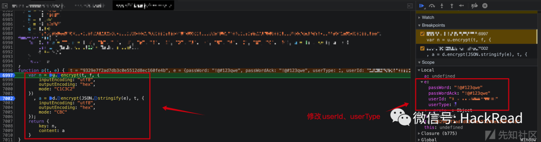 进入函数,找到核心代码,p()函数传入密钥(t)和待加密数据(e)两个值,可以看到断点处此时userId和userType未绑定值,函数内使用sm2算法对密钥加密、aes算法对数据加密,然后分别放入key和content字段返回,这种结构类似https模型,使用非对称算法加密密钥、对称算法加密数据