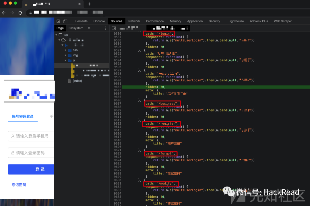 前端逻辑由js控制,全网站请求路径及参数构造方式明文出现在js中,打开开发者工具即可看见敏感信息