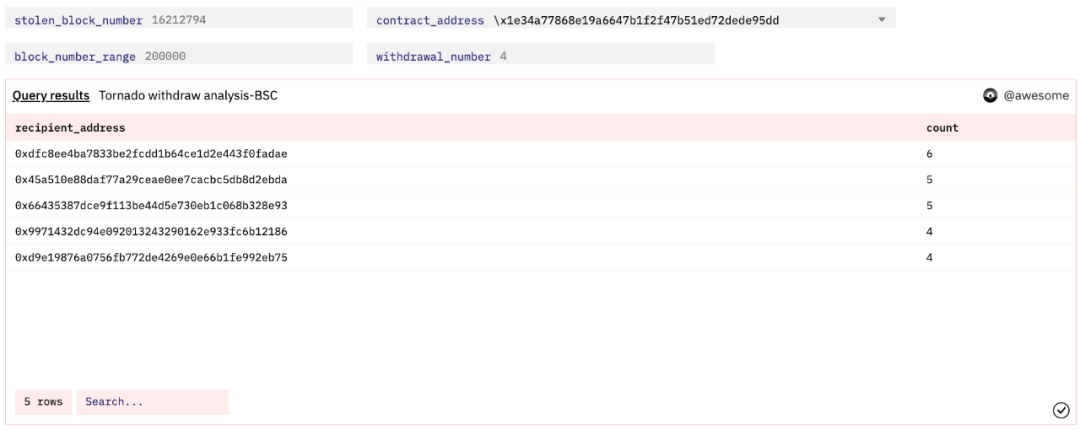 下图是提款分析过程中使用的工具 (https://dune.com/awesome/Tornado-withdraw-analysis),用于过滤符合筛选特征的 TornadoCash 提款地址。