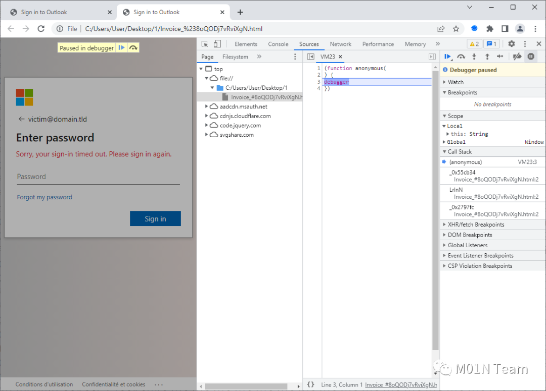 寻找HTML页面对应的钓鱼服务器最直接的方式,就是打开“开发人员工具”面板并查看网络选项卡。但是当研究员在该HTML页面上打开开发人员工具时,会看到一条“debugger paused”异常信息,这是由于在混淆的JavaScript中使用了“debugger;”的反分析/反调试技术,具体见开源项目地址:https://github.com/weizman/awesome-javascript-anti-debugging