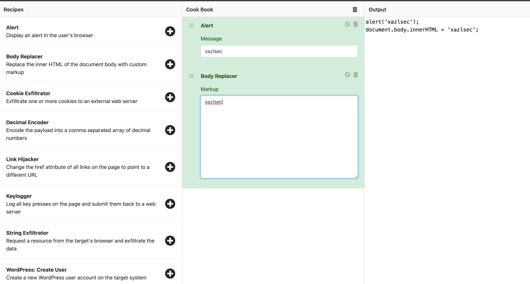 除了这个,再推荐一个可以通过点击生成相应功能的 js 代码,包含弹窗、内容替换、键盘记录等: