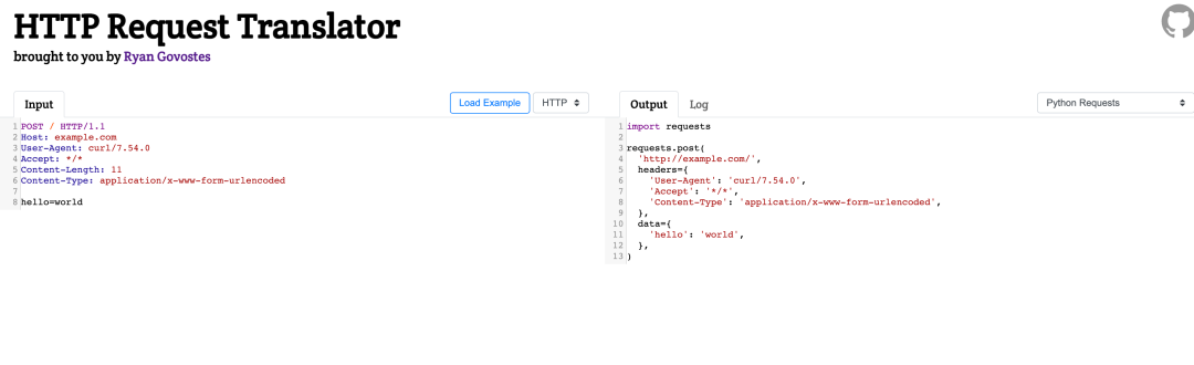 可以将 curl、http、json 的请求,转换为 python、javascript 的代码请求,比如将 http 请求转为 python: