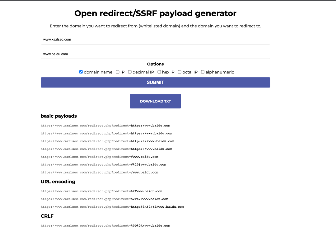 这里提供一个开放重定向漏洞 payload 生成器,输入重定向目标的域名和需要重定向后的域名,即可根据不同的选项来生成利用 payload: