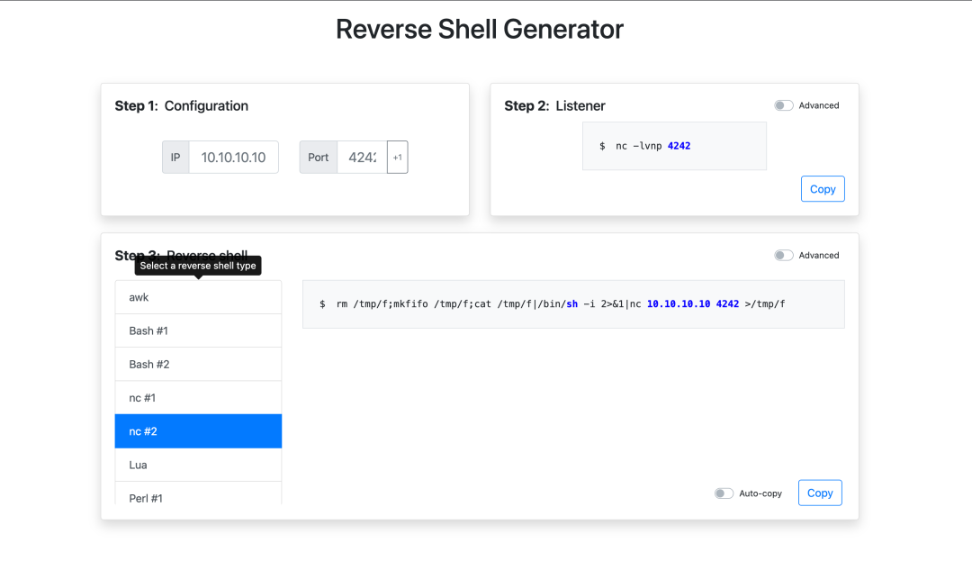 输入自己的 IP 即可生成一句话反弹 shell 的语句: