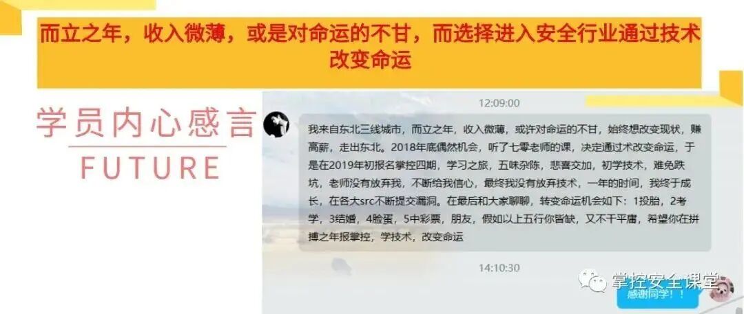 A:腾讯课堂补贴,3天训练营货真价实限时免费哈!掌控安全学院是腾讯课堂官方认证的安全学院,已累计培养数千名安全人才,绝对官方可靠!