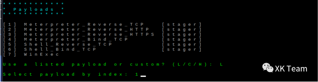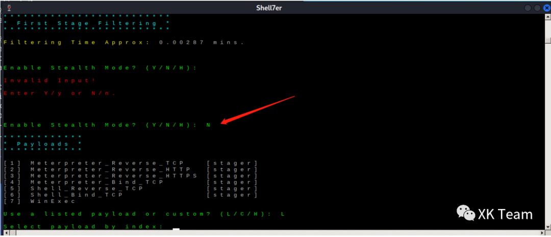 等待生成结束后,它会询问我们是否启用隐身模式,可以根据情况,但是启用隐身模式后免杀能力会变弱,所以不建议启用,然后下一步选择 L 列出负载。