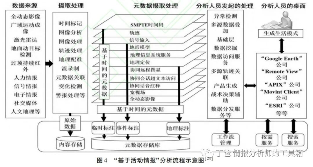关联、分析”作为驱动分析工作的核心环节 。在数据驱动式分析流程中,数据会“自动提醒”分析人员忽略了哪些缺口和漏洞,并由此来驱动其他相关情报活动,加速整个流程的运转。以美“基于活动情报”(Activity Based Intelligence,ABI)的分析流程为例:诞生于反恐、反叛乱战场的“基于活动情报”被誉为“ 情报机构从全球反恐战争 中汲取的最宝贵财富”,它以目标人群的重要动向( activity)为分析重点,通过描绘目标人群的生活模式( Patterns of Life,