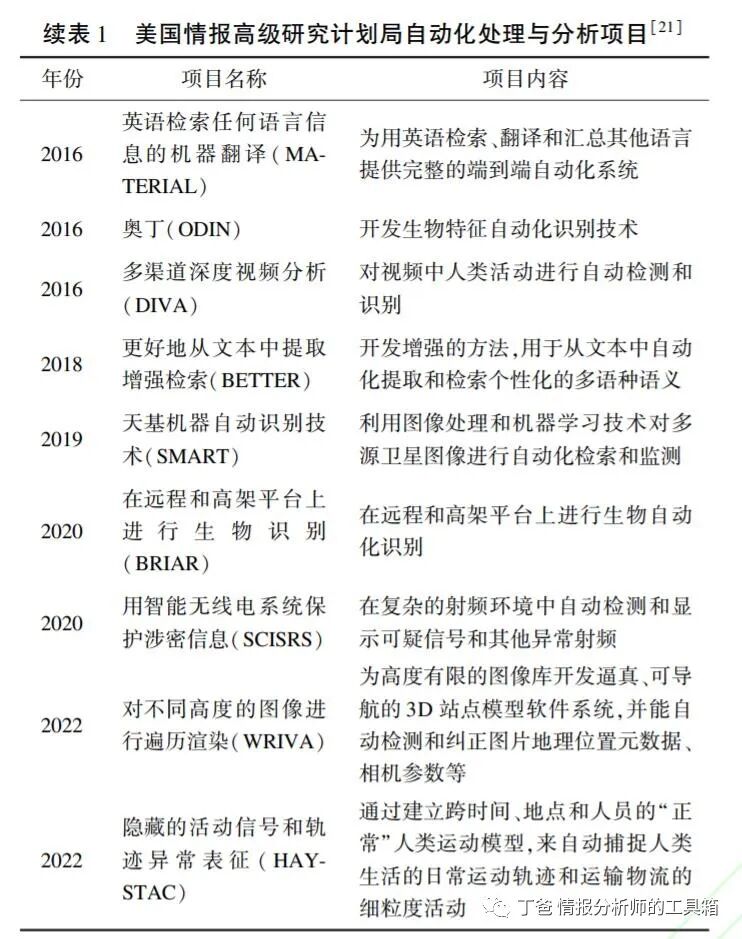 (Intelligence Advanced Research Projects Activity)的情报分析研究项目为例。该机构下设的分析办公室着眼于未来情报界成员面临的共同分析挑战,研发相关技术。在其研究项目中,比重最大、数量最多的研究领域是自动化处理与分析(见表 1),涉及大数据、可视化、