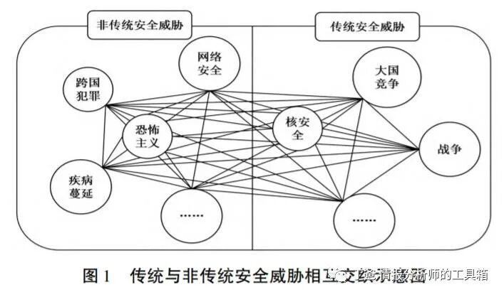 智能感知、智能决策与智能行动等智能技术群,不断对美情报部门所面临的安全形势、业务环境及技术运用产生影响,驱动其分析转型。美情报部门认为,美正面临着建国以来最复杂的安全环境。一方面,以俄罗斯、朝鲜、伊朗为代表的传统威胁依然对美构成重大挑战 ,且在智能化时代,这些传统威胁不断呈现出新的特点。例如,过去十几年来,美俄之间不断利用人工智能技术在舆情干扰等各个安全领域展开竞争博弈。 另一方面,非传统安全威胁不断涌现,恐怖主义、新冠肺炎疫情、气候问题等威胁接连爆发。对于美情报分析工作而言,传统与非传统安全威胁相互交织 (如图 1 所示),并在智能技术群的影响下形成级联效应,最终会导致未知威胁的大量涌现。即与冷战时期明确的威胁对象———苏联,明确的威胁形式———军事、政治、经济等相比,智能
