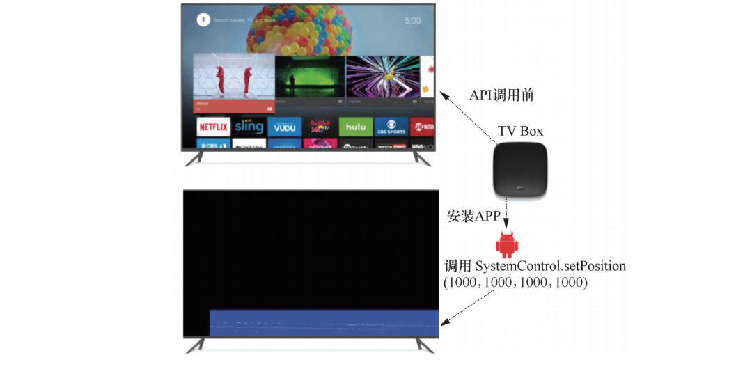 Android智能电视通常在标准Android开源项目基础上进行个性定制,添加额外的系统组件支持电视功能。为了了解Android电视的个性定制程度,我们提取了多款Android智能电视的固件,发现自定义的API数目相当大,在H96 Pro设备上的自定义API甚至多达101个。由于这些系统组件运行在高特权进程中,如果缺乏恰当的保护而被利用进行攻击将导致较为严重的危害。例如,在小米MIBOX3中,SystemControl.XYZ(int x, int y, int w, int h) 这个API用于设置HDMI屏幕以宽w高h的尺寸显示在坐标(x,y)的位置上。通过分析,我们发现这个API没有实施任何保护,允许任何应用使用任意参数值调用这个API,这将破坏屏幕显示。图1展示了MIBOX3的首页屏幕在以参数值(1000,1000,1000,1000)调用这个API前后的显示情况。调用后,显示位置被移到了屏幕的右下方,显示内容变得混乱。并且,这个API对显示参数的设置是永久的,无法通过重启设备的方式恢复,只能进行硬件重置。这个漏洞可以被进一步用于恶意攻击:通过与其他的侧信道技术相结合,可以针对特定应用发起拒绝服务攻击。例如,当检测到Netflix应用在前台运行时,可以利用这个API的漏洞使得屏幕内容显示失败,勒索用户付费。