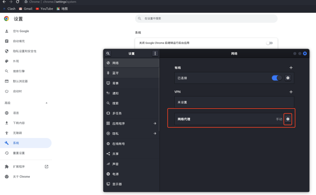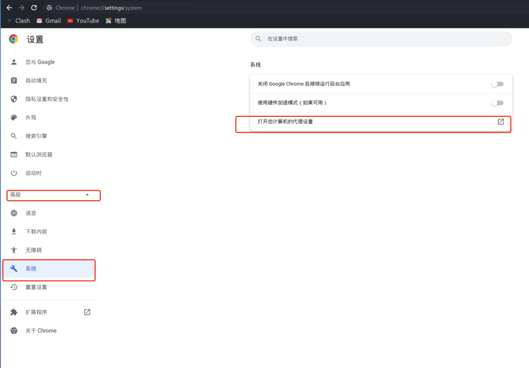 谷歌浏览器设置代理点击设置-->高级-->系统--打开计算机的代理设置