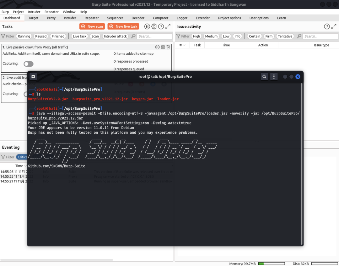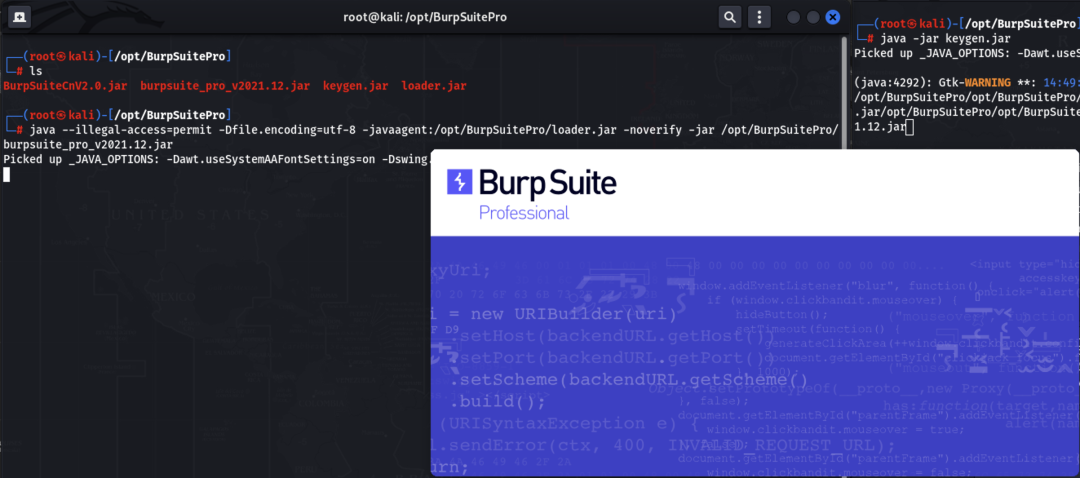 java --illegal-access=permit -Dfile.encoding=utf-8 -javaagent:/opt/BurpSuitePro/loader.jar -noverify -jar /opt/BurpSuitePro/burpsuite_pro_v2021.12.jar