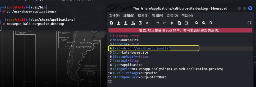 sudo mousepad kali-burpsuite.desktop找到Exec= 这行,修改为