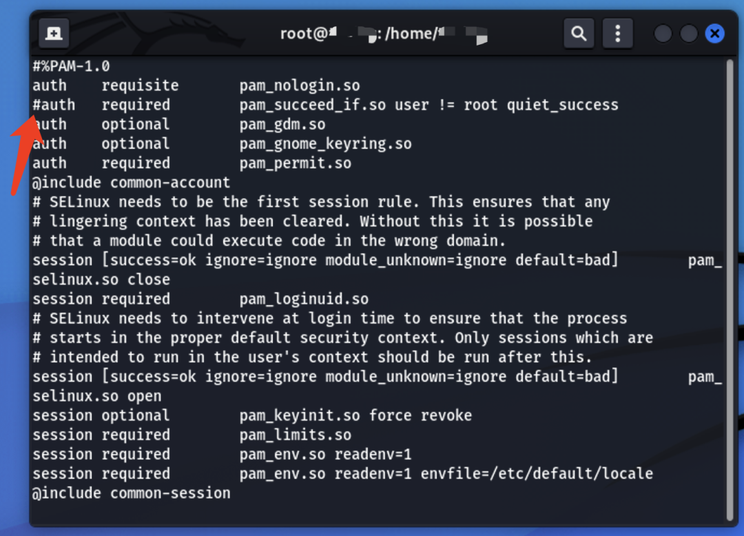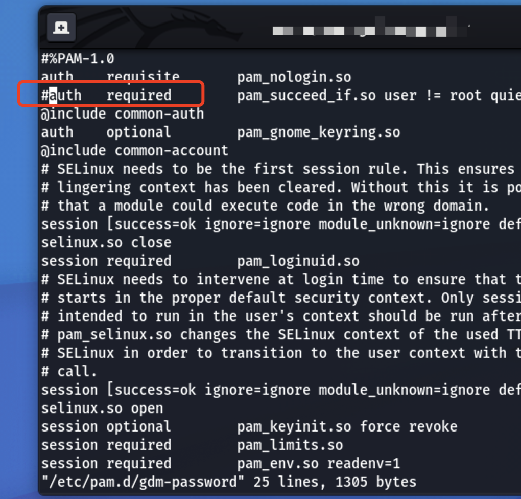 输入命令vi /etc/pam.d/gdm-password,按照上文方法将第三行文本修改为下图修改完成后按