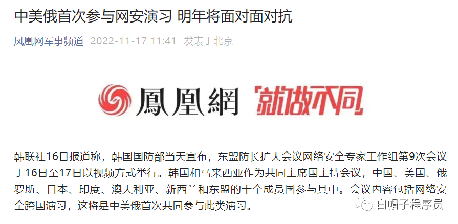 今天凤凰网军事频道报《中美俄首次参与网安演习 明年将面对面对抗》