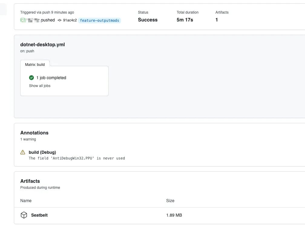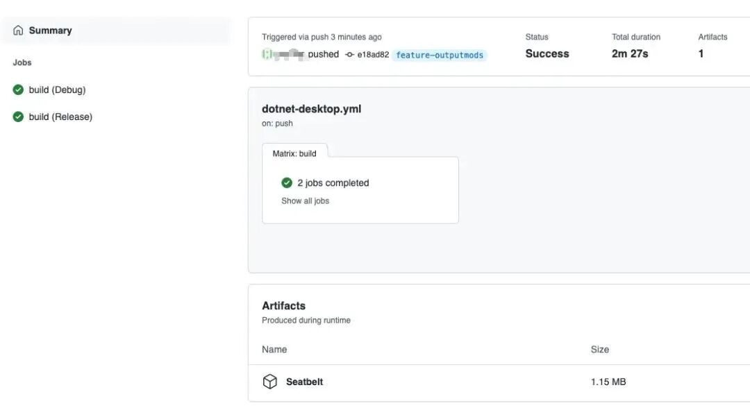 所有配置完成之后,触发并成功构建之后,便可直接下载Seatbelt可执行文件即经过混淆的版本。