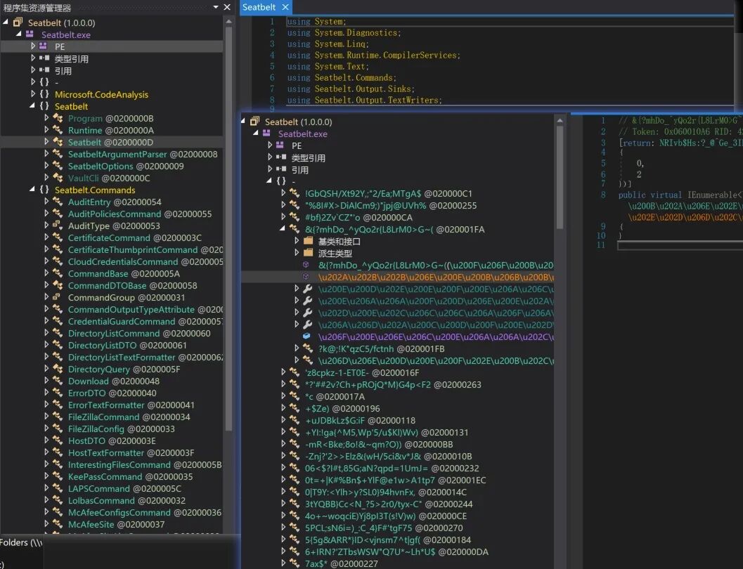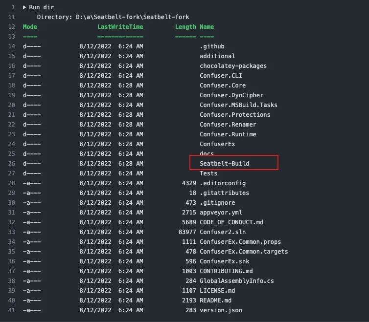 这种情况,可以通过path指令指定拉取的仓库相对于当前路径的保存位置。这里,将Seatbelt仓库保存在了名为Seatbelt-Build的目录中。然后,再编译Seatbelt,生成exe可执行文件。然后,使用ConfuserEx2对Seatbelt.exe进行混淆操作并上传。