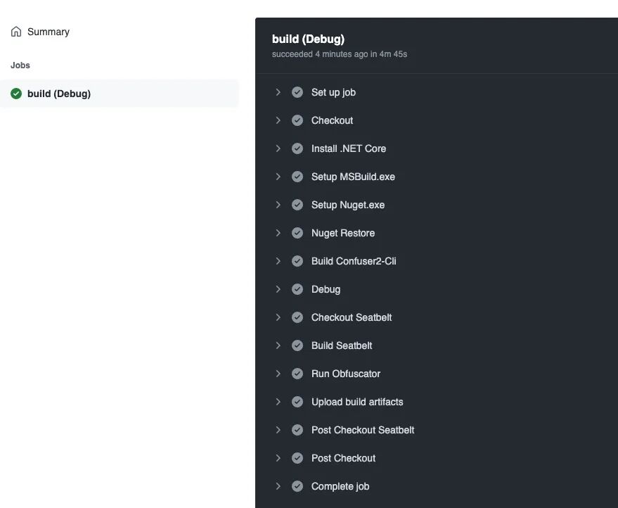 - name: Run Obfuscator shell: cmd run: ${{ github.workspace }}\Confuser.CLI\bin\Debug\net461\Confuser.CLI.exe ${{ github.workspace }}\Seatbelt-Build\Seatbelt.crproj