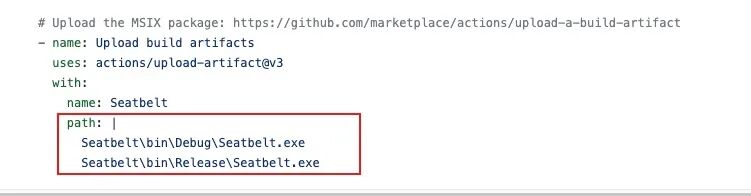 - name: Upload build artifacts uses: actions/[email protected] with: name: Seatbelt path: | Seatbelt-Build\Seatbelt\bin\Debug\Seatbelt.exe Seatbelt-Build\Seatbelt\bin\Debug\Confused\Seatbelt.exe