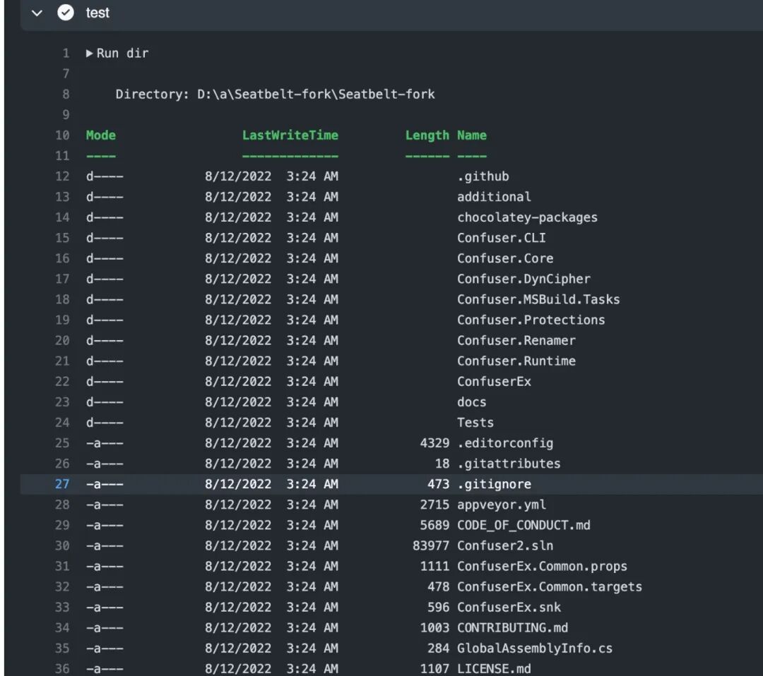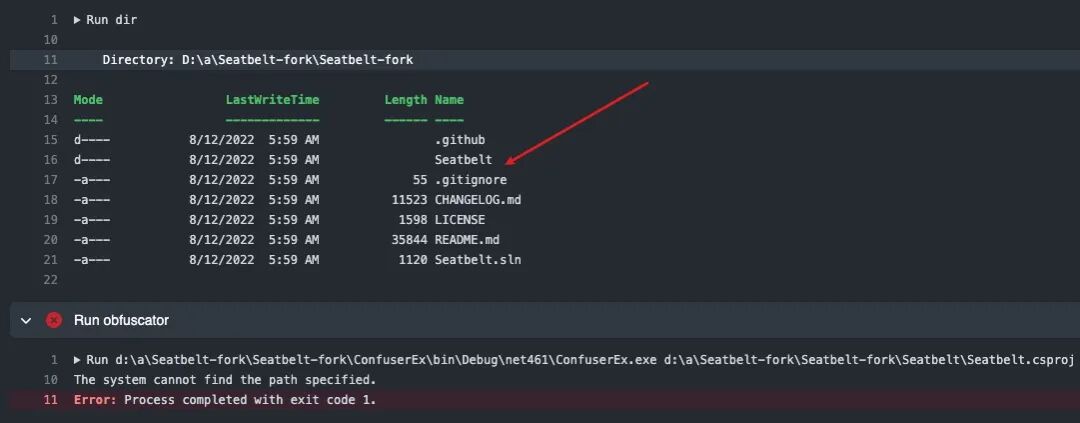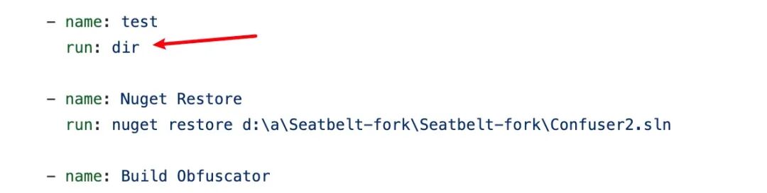 ⚠️注意:这里的路径问题,在现有仓库中引入了另外的仓库,比如这里的ConfuserEx2-fork,新的仓库内容将保存在${{ github.workspace }}目录中,而非${{ github.workspace}}\ConfuserEx2-fork\目录。这里很容易出错,必要时可使用命令执行模块执行dir进行查看。