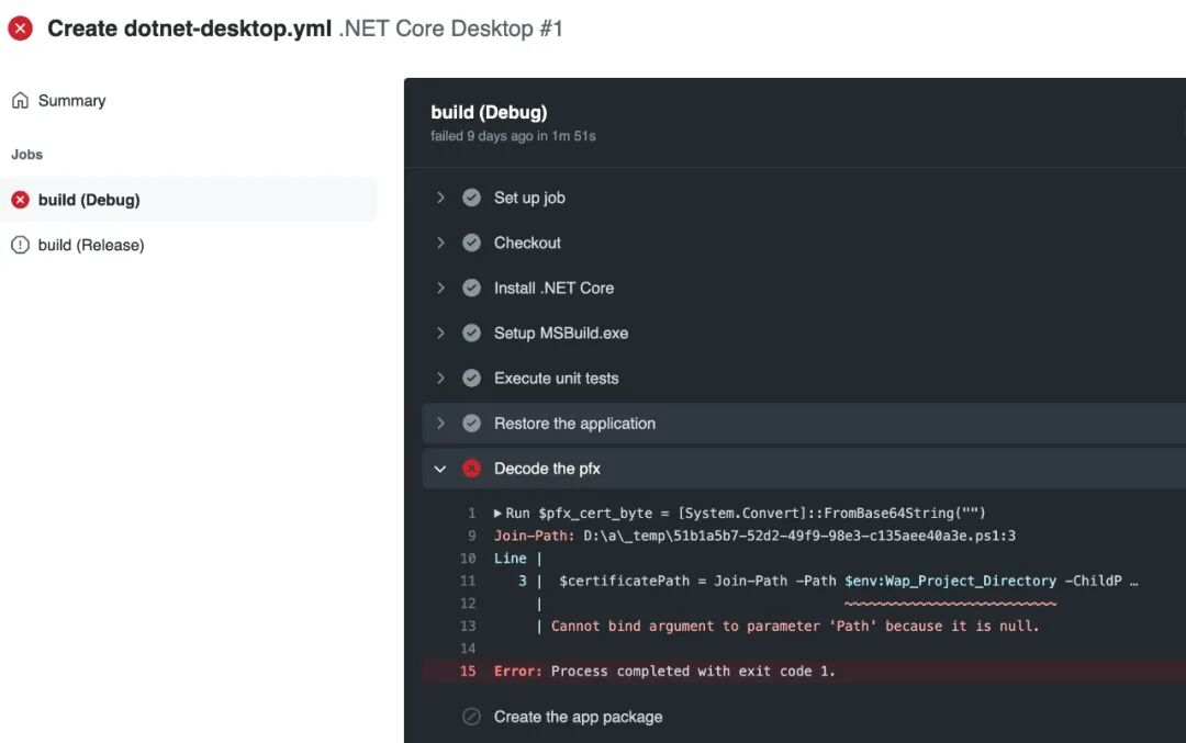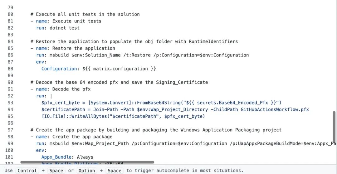 然后就可以在Action中,使用环境变量${{ secrets.Secret名}}对其进行引用,而不用将其硬编码在配置中。之后的步骤,基本和之前的构建步骤一致,包括安装.Net运行时环境、配置MSBuild构建工具、安装依赖、编译生成exe可执行程序。