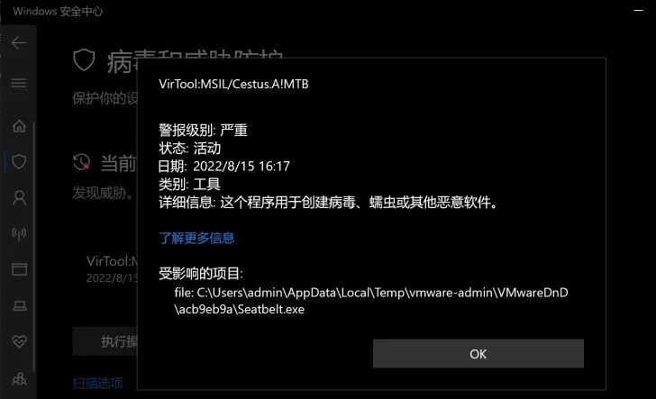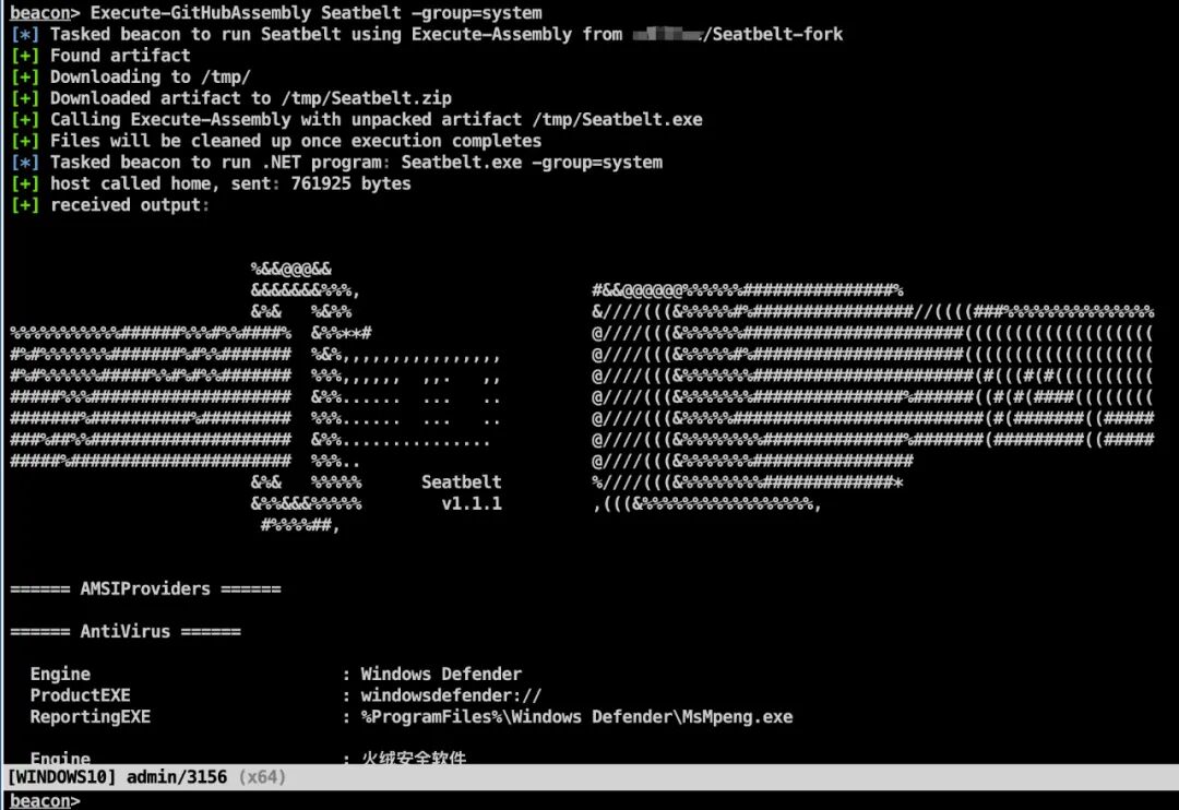 未经混淆的Seatbelt直接被Defender查杀,而混淆版则没被查杀。