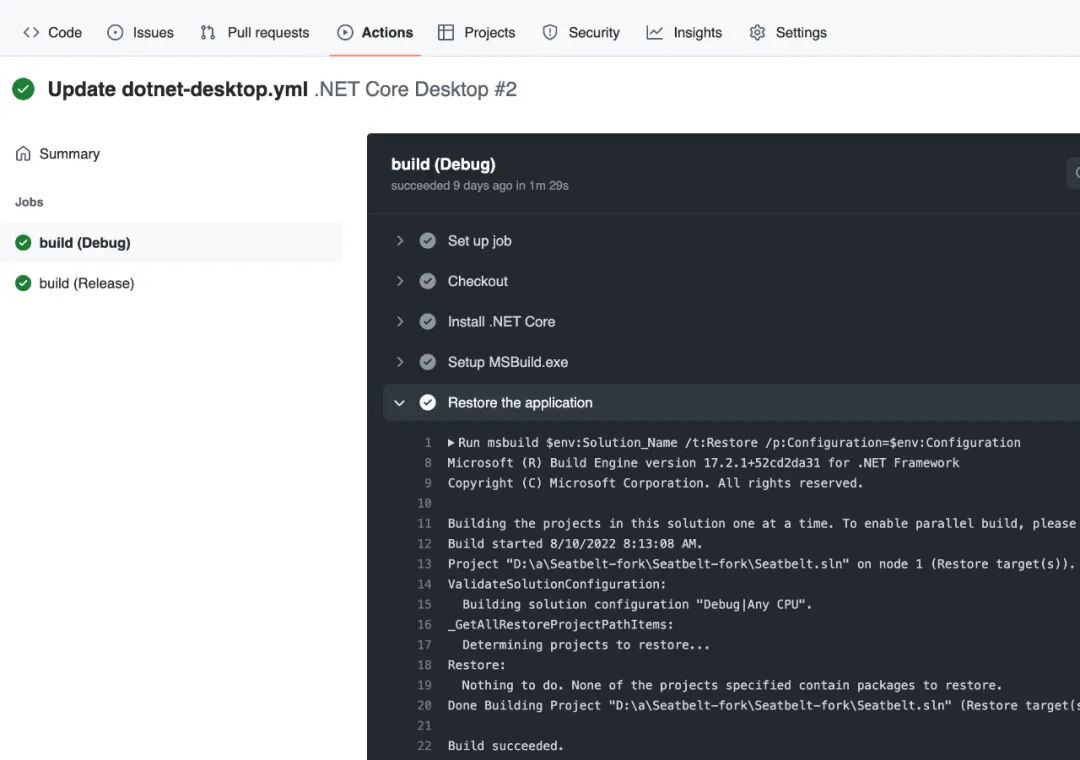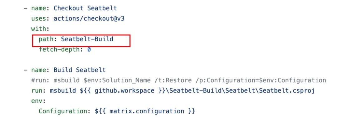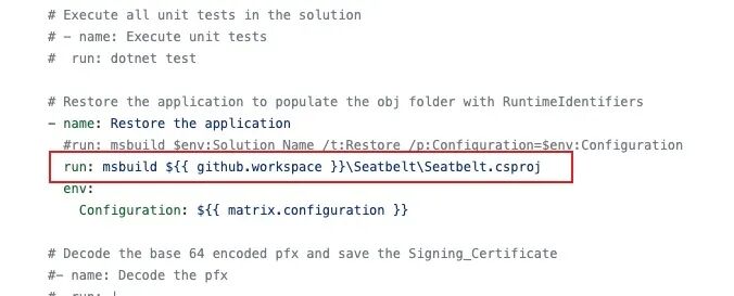 - name: Build Seatbelt #run: msbuild $env:Solution_Name /t:Restore /p:Configuration=$env:Configuration run: msbuild ${{ github.workspace }}\Seatbelt-Build\Seatbelt\Seatbelt.csproj env: Configuration: ${{ matrix.configuration }}