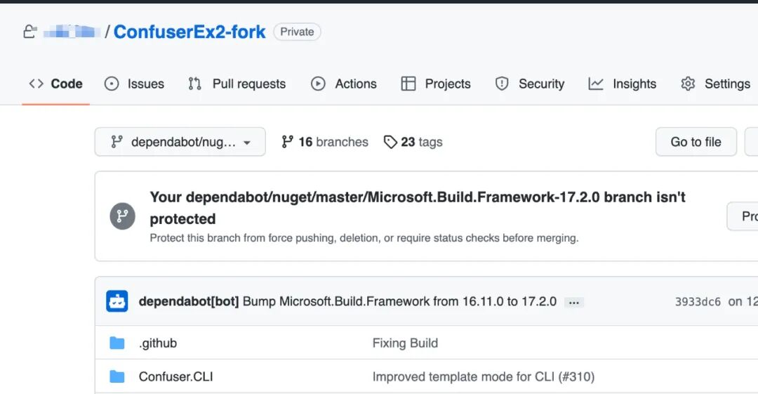 很多红队工具会被杀软查杀,因此考虑在构建过程中,使用混淆器自动对工具进行混淆处理。这里使用ConfuserEx2这款混淆器为例。在之前的Workflow中,会增加几个额外的步骤。包括拉取混淆器ConfuserEx2仓库,编译生成混淆器可执行程序,且在Seatbelt构建成功之后,使用混淆器对Seatbelt可执行文件进行混淆处理。同之前步骤一样,我们先创建一个ConfuserEx2的私有分支。