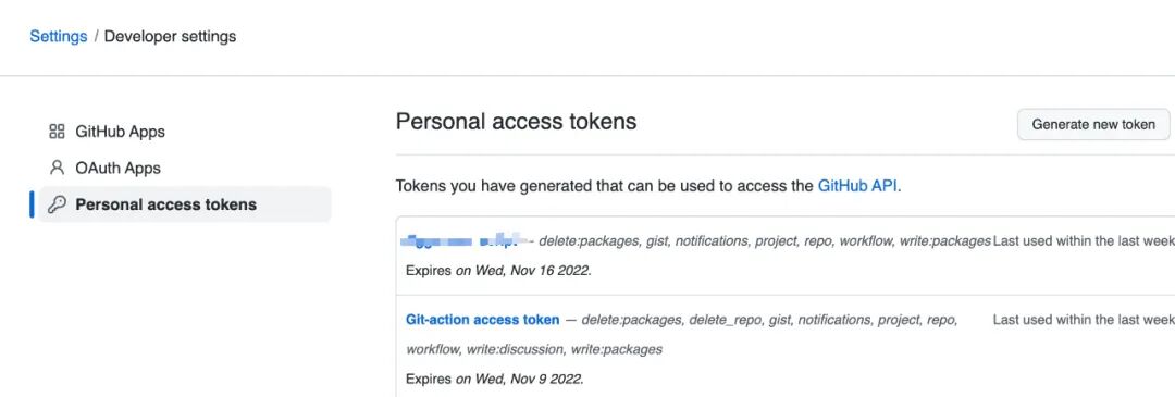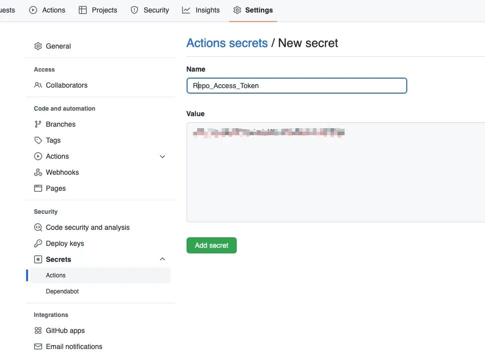 因为要访问私人仓库,因此需要配置访问凭据。否则构建容器将无法访问我们的私有仓库。为了实现此目的,我们生成新的Personal Access Token(个人访问令牌),并将其作为secret保存在我们的仓库中。Github访问Settings->Developer settings——>Personal access tokens,生成新的Token。然后,在要自动构建的仓库Settings选项卡——>Actions——> New secret,创建新的Secret,将之前创建的PAT作为其值进行保存。