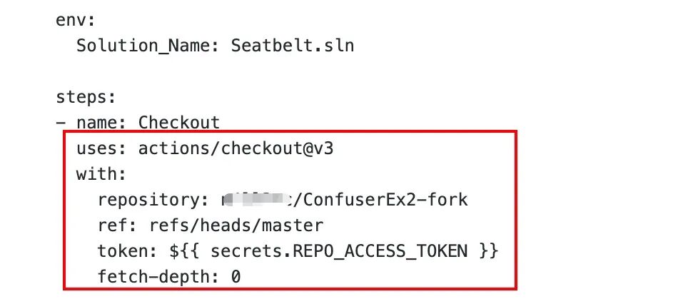 steps: - name: Checkout uses: actions/[email protected] with: repository: <Github账户>/ConfuserEx2-fork ref: refs/heads/master token: ${{ secrets.REPO_ACCESS_TOKEN }} # 替换为自己的PAT fetch-depth: 0