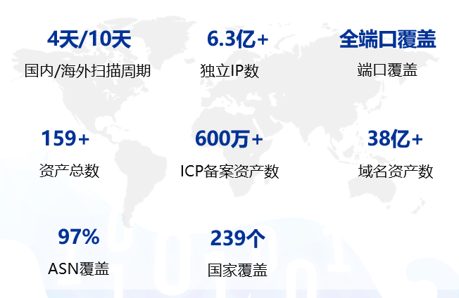 截至2022年10月,鹰图平台(HUNTER)已经累计探测全球独立IP 6.3亿+,网络资产159亿+,域名资产38亿+,ICP备案资产600万+;实现全端口覆盖,覆盖全球239个国家,覆盖全球97%的ASN网络自治域;国内高频端口4-7天更新,海外高频端口10-30天更新。