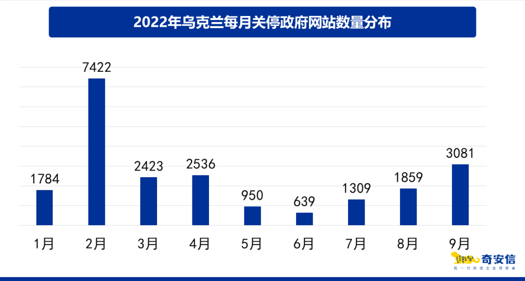 而在所有这些乌克兰境内的Web资产中,共发现36582个政府网站。而通过持续监测数据对比发现,至少有20219个乌政府网站,在俄乌冲突爆发后被关停,约占乌克兰政府网站总数的55.3%。仅冲突爆发的2月,就有7422个政府网站被关停,约占乌克兰政府网站总数的20.3%。