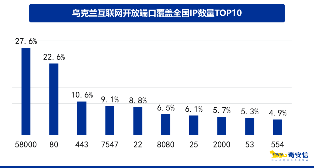 鹰图平台(HUNTER)对全球主机的网络开放服务端口进行监测发现:与全球其他地区相比,乌克兰的网络存在一点显著的特殊之处,即全网开放最多的端口,并不是全球流行的80、443、7547、22、8080等端口,而是58000端口,共计约70.4万个,覆盖了乌克兰境内27.6%的IP地址。分析认为,这应该是很多乌克兰本地运营商为用户提供服务的默认端口。特别的,乌克兰最大的电信运营商Ukrtelecom JSC,归属其下的IP地址,93.5%都开放了58000端口。