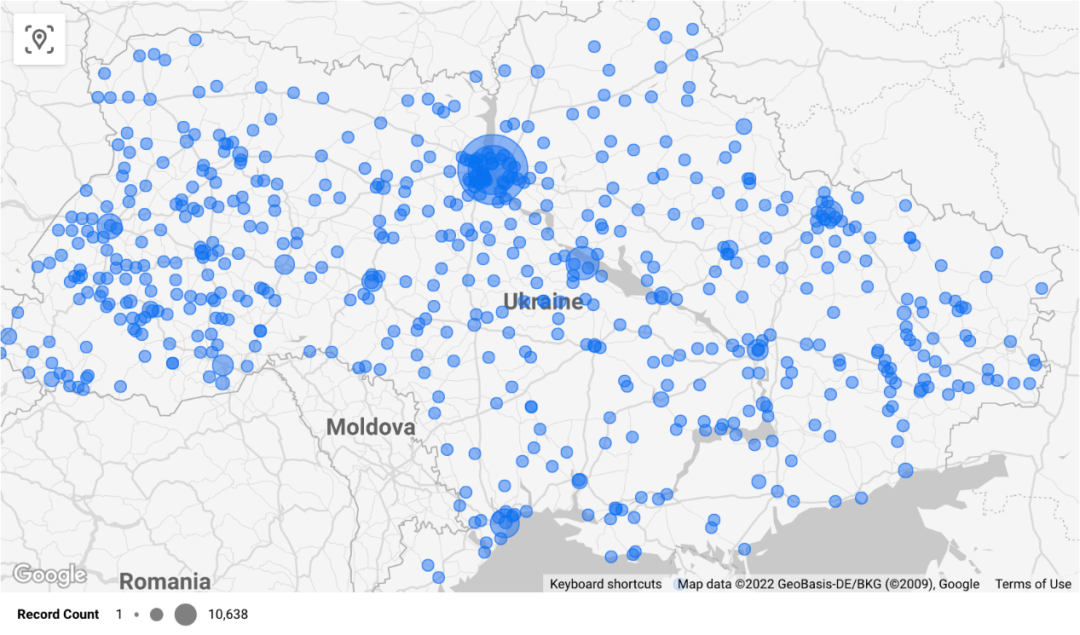对处于战争或冲突中的国家来说,情报保密工作无疑的至关重要的。然而,根据鹰图平台(HUNTER)的监测数据显示,在乌克兰境内,至少有21.6万个商用摄像头的配置页面被暴露在互联网上,涉及6.7万多个IP地址。这些摄像头分布在乌克兰全境各地,客观上形成了一个庞大的、潜在的情报泄露网络。下图是使用Google地图系统生成的乌克兰境内被暴露在互联网上的摄像头的地理位置分布。其中,基辅地区最为集中。