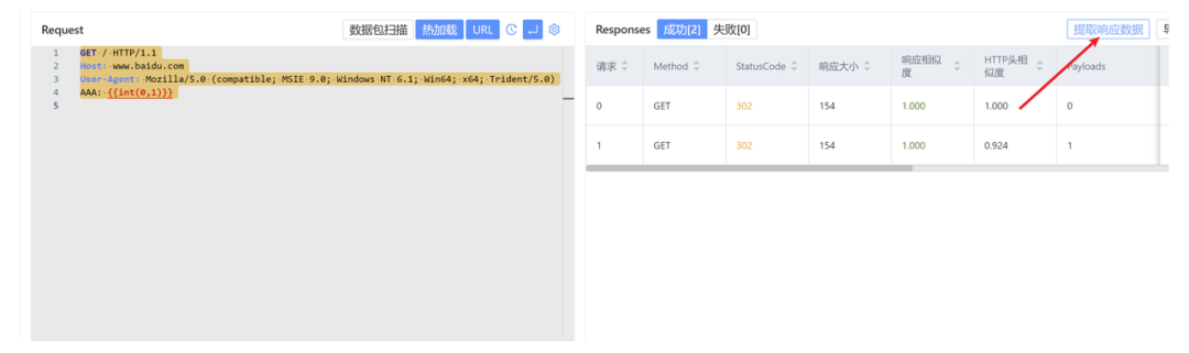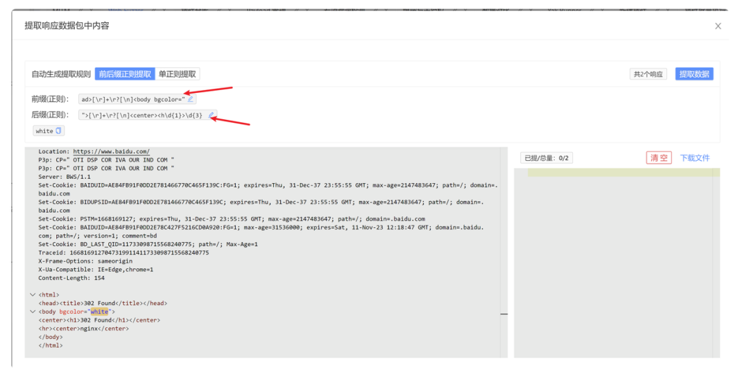 像这样随便插入⼀个Fuzztag获取response,就可以用提取响应数据的功能来获取正则。